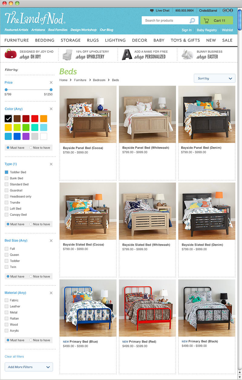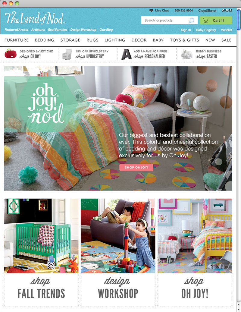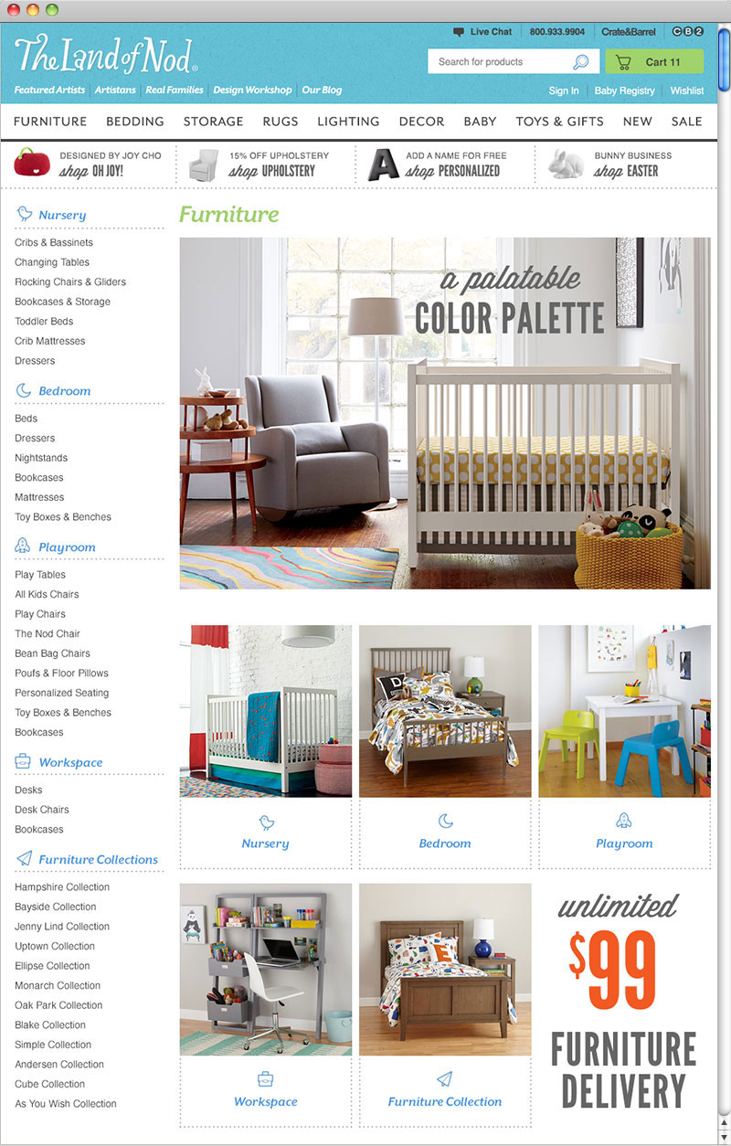 specializes in children’s furniture, bedding, accessories and toys. The Land of Nod offers design for kids and people that used to be kids.