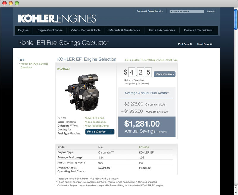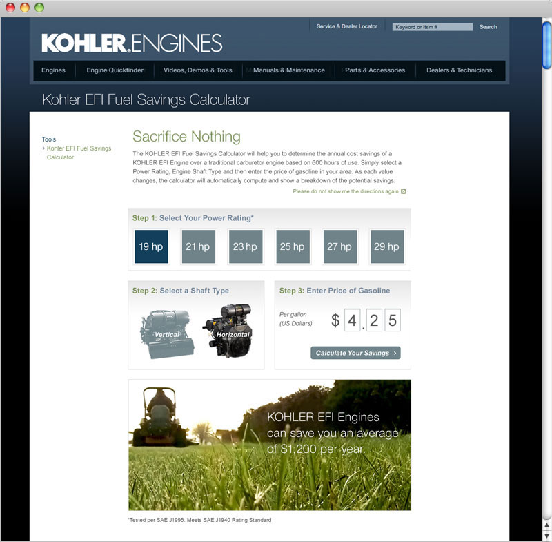 Kohler Engines needed a simple-to-use online tool to show customers the fuel savings of selecting a Kohler EFI engine over a standard carbureted engine. Our solution was a calculator that allows users to enter power rating, shaft type and fuel cost to see their annual savings.