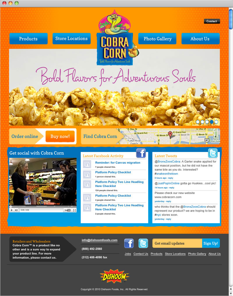 Cobra Corn is a new snack developed by a young entrepreneur based on an old family recipe. In an effort to connect with users and showcase Cobra Corn's fast-growing distribution network, the site focuses on social media and an interactive store locator.